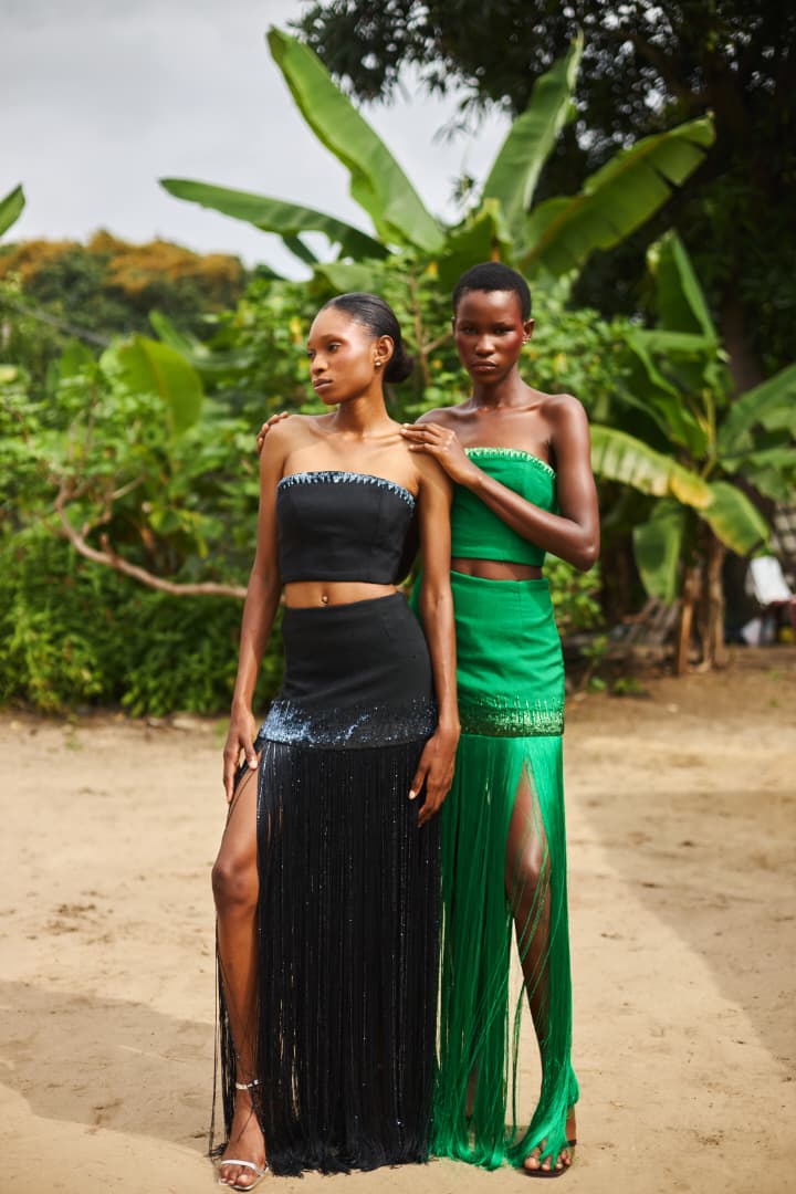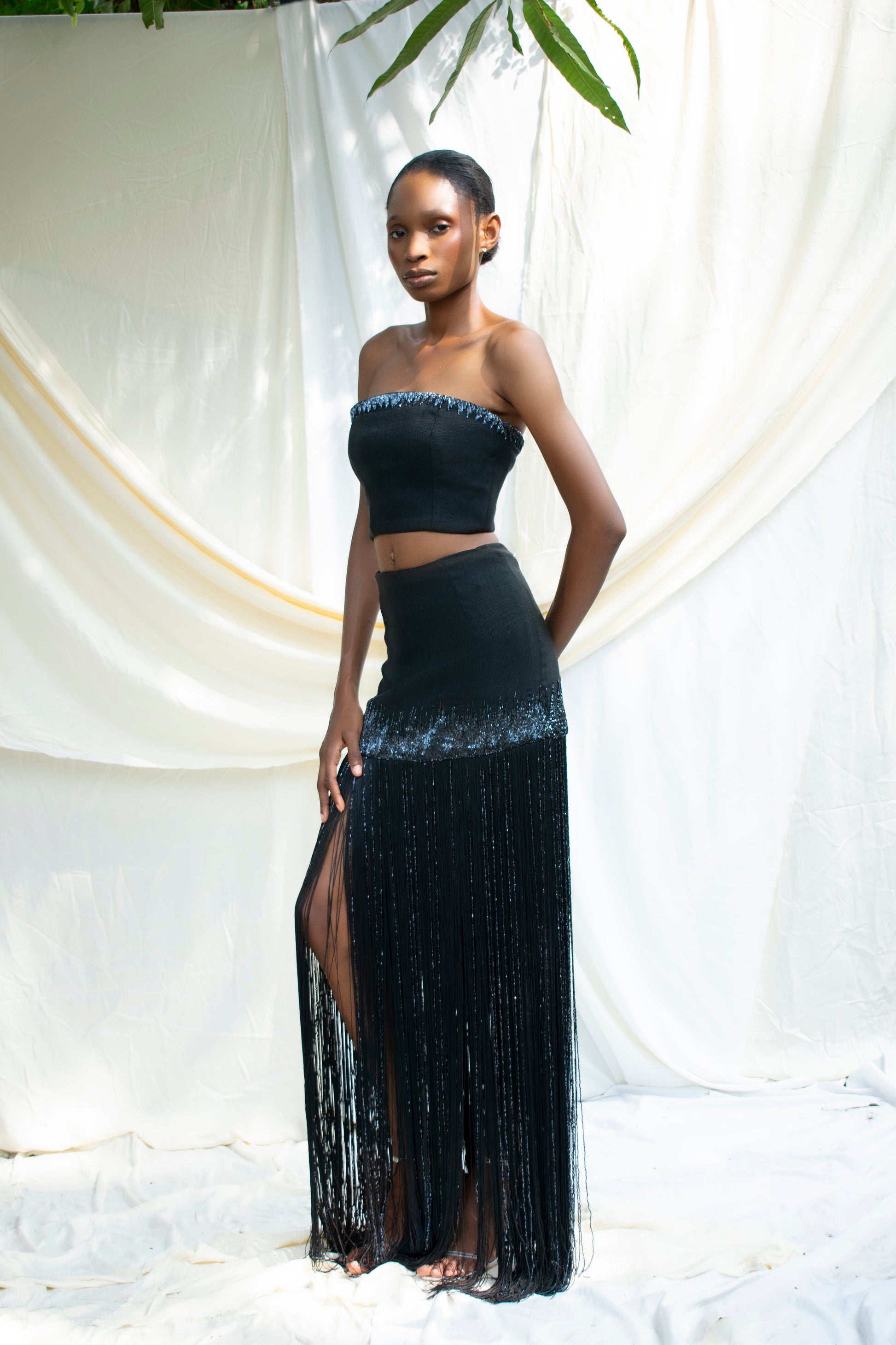 Hand woven Aso Oke Skirt with Fringe and bead detail with centre back zip closing.