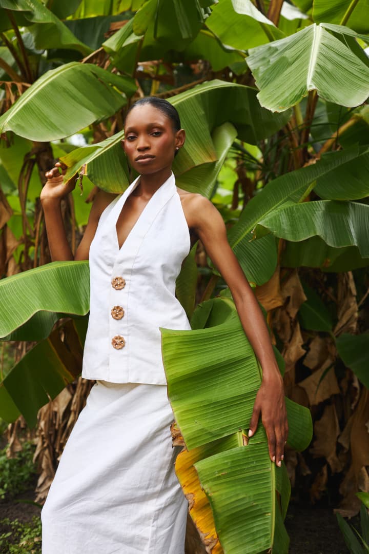 High-waisted linen skirt with centre back vent and centre back zip closing.