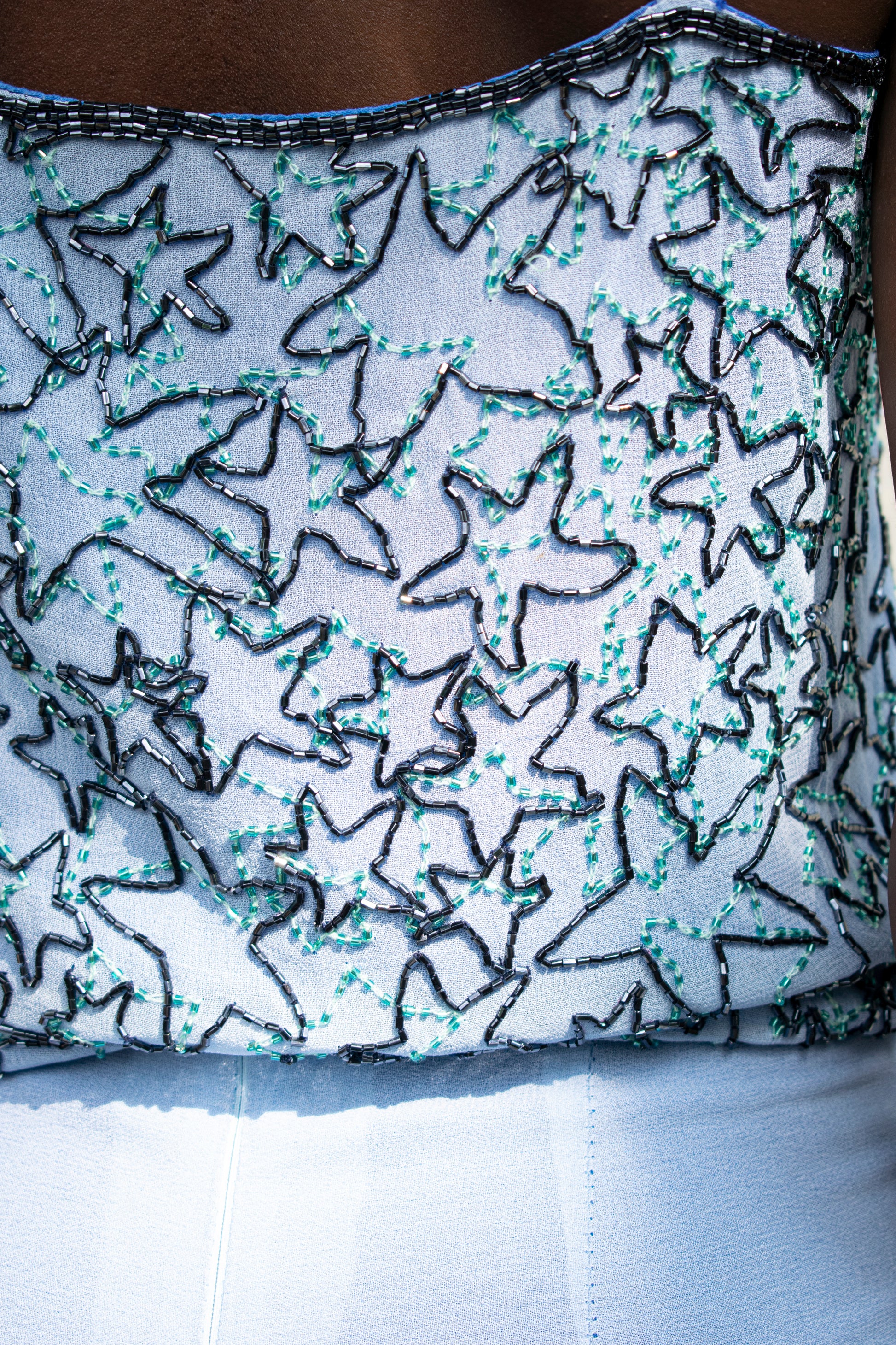 Hand beaded two layer chiffon and crepe top with slip-on opening.